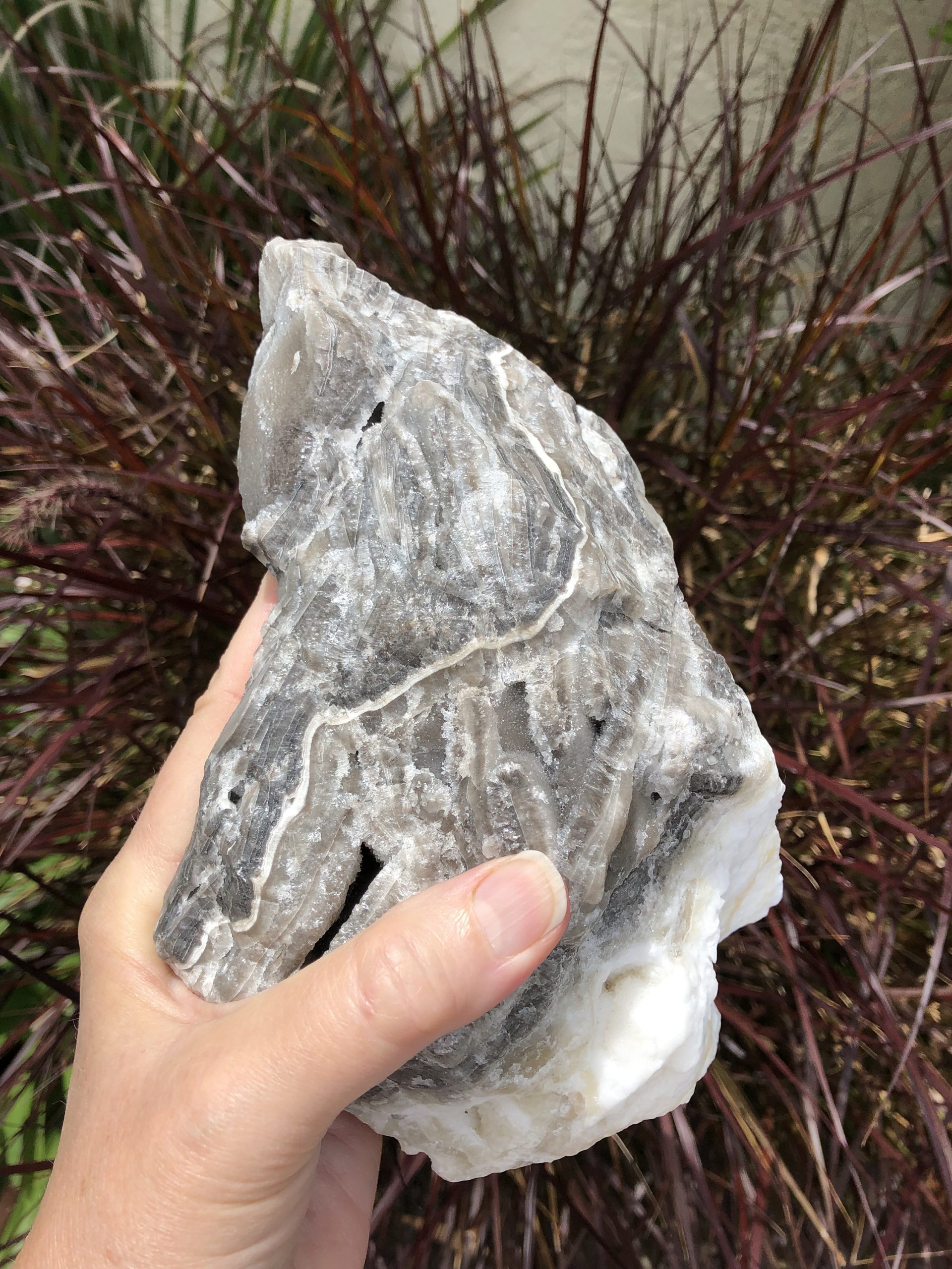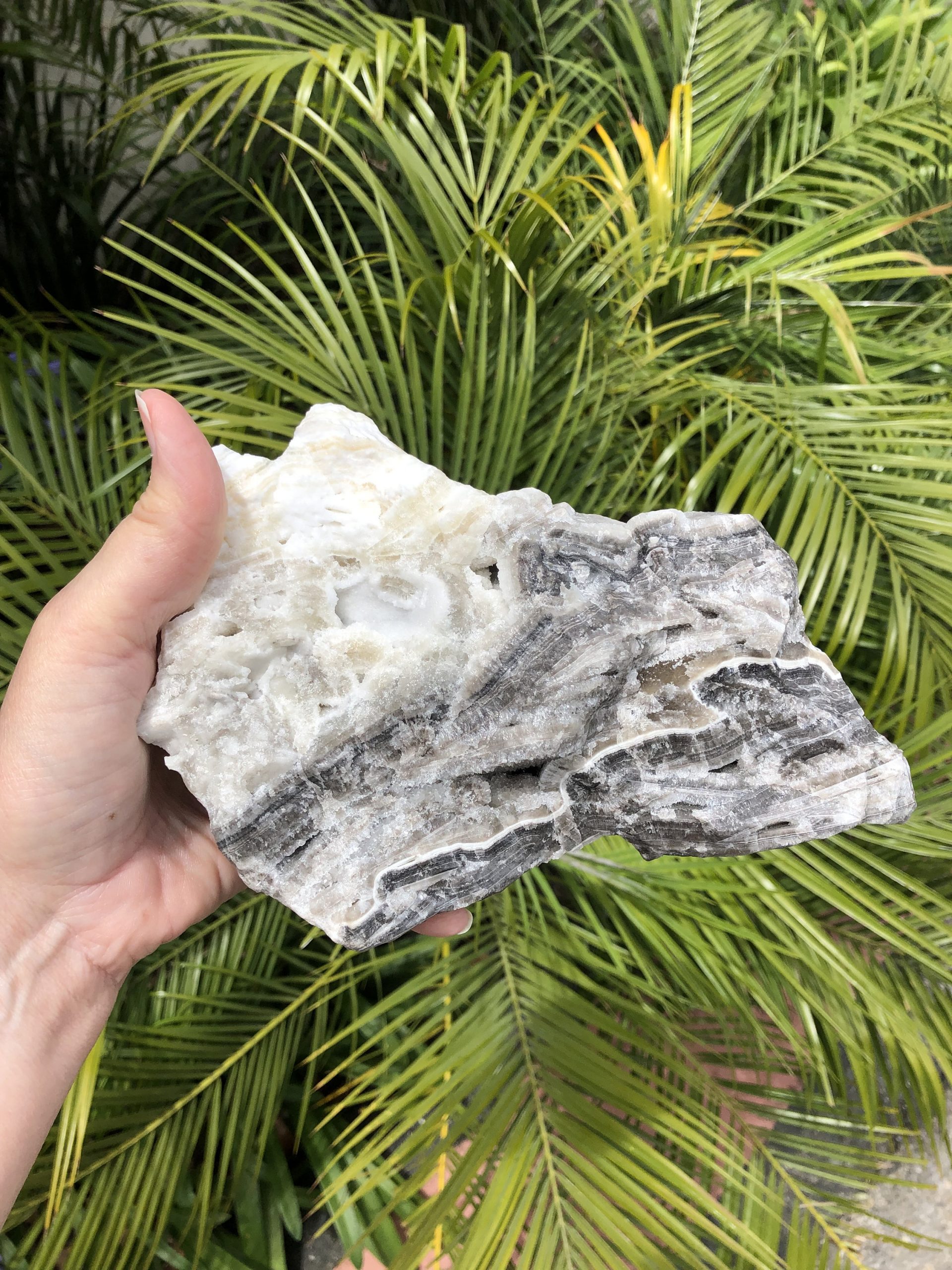 Amazing and Rare Gray, Black and White Calcite Specimen from Mexico with Druzy Crystals! I am so in Love with this hunk of calcite goodness! Probably the most stunning part of it to me is the fact that is has so many areas of druzy- and some of them are even stellar beam! It also has bands of color that are so unique and rare is this type of calcite! It’s definitely one of those specimens that you just want to keep looking at as there is so much to see! The energy of this specimen is very High yet soothing. This is also a lovely display piece! It is hard to do it justice in photos and hard to video due to its size and weight.