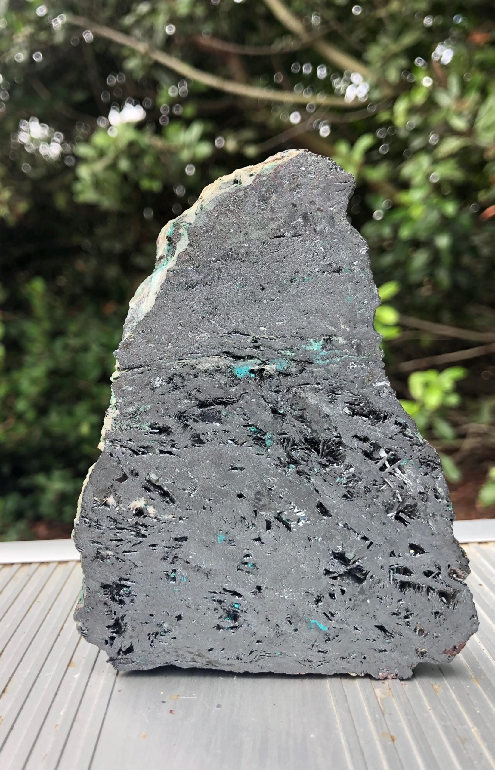 Hematite with chrysocolla slab stone! It is polished on one side and matte on the other leaving the sides raw and natural. It comes from the Planet Mine in Arizona, USA. It can also be used as a charging plate.